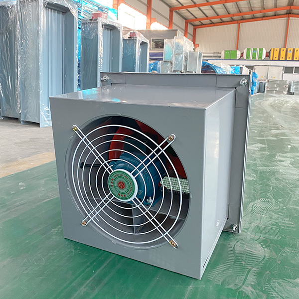 风机外壳应为镀锌钢板[选项:环氧树脂喷涂]制成的正方形,电机支撑结构应坚固并避免风机运转时产生共振。在室内侧装有防护网以保护工作人员人身安全,在室外侧装有45度防雨罩和不锈钢防鸟网,以防止雨水和鸟类进入室内。